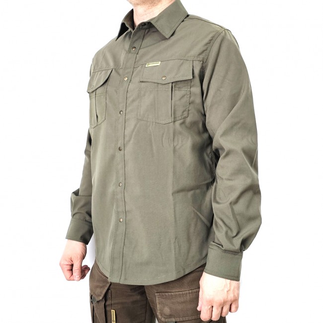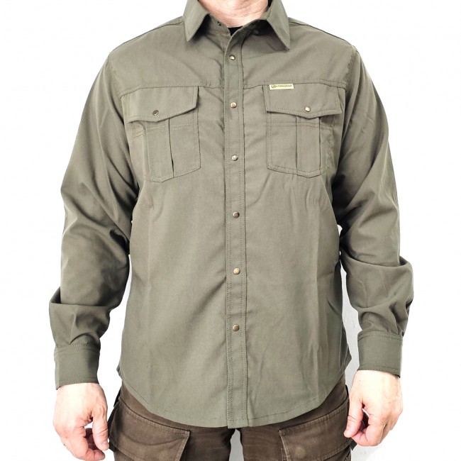 Мужская рубашка из плотной ткани, в класическом милитари стиле, на металлических кнопках, с двумя накладными карманами на груди, с клапанами.